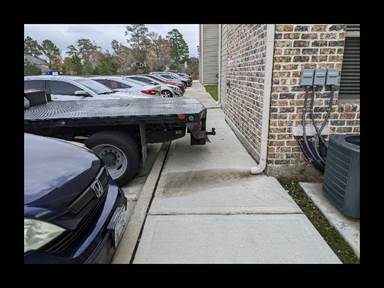 The images included here illustrate sidewalks that appear compliant based on their constructed width yet are rendered unusable when parked vehicles encroach into the pedestrian path. In one example, a trailer hitch reduces the sidewalk to just 24 inches of clearance. In another, a flatbed truck has been backed into a head-in space, with the bed extending far enough to completely block pedestrian access. This is a dramatic but instructive example—not of a design flaw, but of how actual parking behavior and vehicle type can create unanticipated barriers.