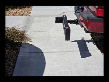 A trailer hitch from a parked truck encroaches into the sidewalk, reducing the clear width and creating a barrier for pedestrians with disabilities.