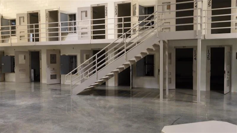 Interior view of a corrections housing unit with cells and stairs.